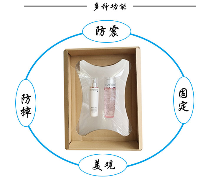 使用兩層韌性極好且較強摩擦力的薄膜將各種形狀的物品夾襯在紙箱內(nèi)起到懸空或緊固定位,有效防止因紙箱收到撞擊或劇烈震動而造成物品觸地?fù)p壞。